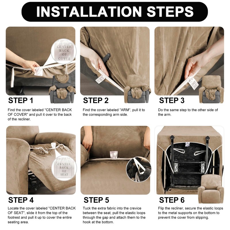 - Stay in Place: Durable elastic hem is well-sewn at the bottom of the recliner cover, making it holds the seat tight. Thick elastic loops can be hooked and secured under the footrest or metal bracket at the bottom, which can prevent slipping. The separated design helps every part of the furniture stays tighter while reflecting the original shape, recommended for both leather and cloth furniture.
