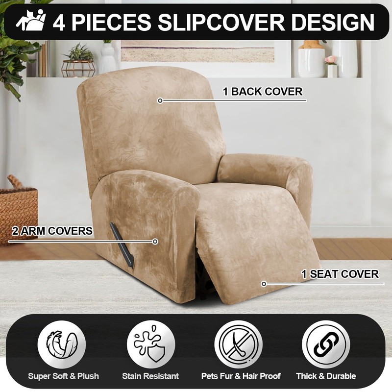 - Separate 4 Piece Design: This recliner cover is crafted from selected premium velvet plush fabric. Includes 2 arm pieces, 1 center back of the seat piece, and 1 center back of the cover piece to fit sofa widths between 23-35 inches. The side of the recliner cover has a handy pocket design that allows you to store your phone, remote control and magazines while you rest in the recliner.