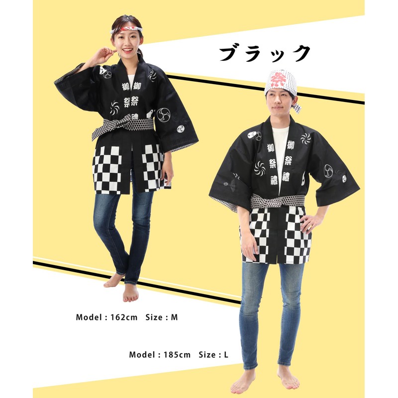 Festival Happi 3-Piece Set, For Adults, 100% Cotton, Waist Strap, Tenugui, Unisex, Festivals, Events, Yosakoi, M/L, Black