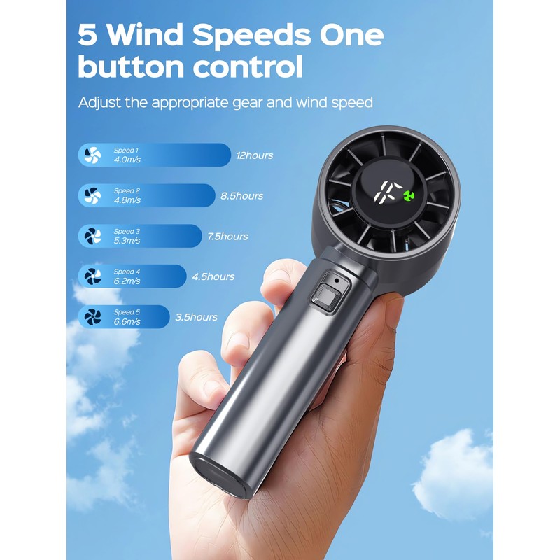- Digital Display - Wind Speed & Battery Reminder: This portable fan is equipped with a high-definition digital display that can show the current wind speed and charging progress. Therefore, you can plan your charging schedule for the handheld fan before traveling. Ensure that you have a cool companion for every trip.