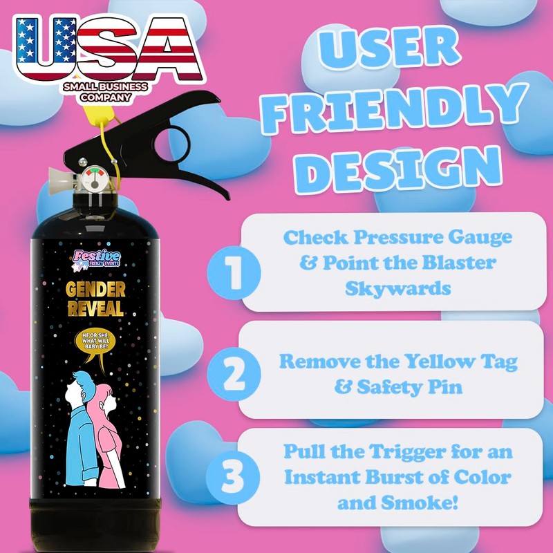 - 2 Two Exciting Options: Choose from our Team Pink or Team Blue Gender Reveal Fire Extinguisher, each filled with non-toxic colored powder. Whether you're welcoming a baby girl or a baby boy, we've got you covered with vibrant and striking hues.