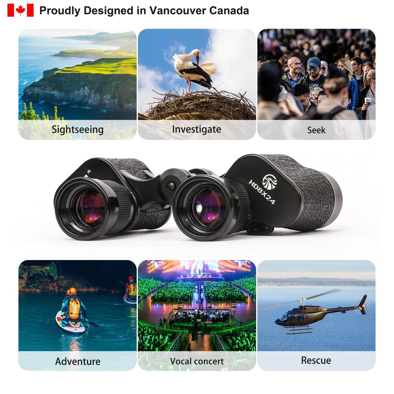 - High-powered 8x24 binoculars with clear, bright images even in low light conditions, perfect for adults and various outdoor activities.