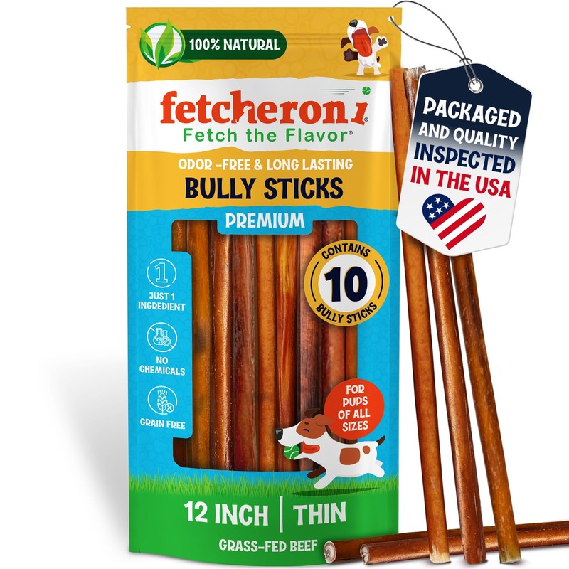 FETCHERONI Odor-Free Thin Bully Sticks (12 Inch, 10 Pack), 9 Ounce Bag, Fully Digestible 100% Beef Pizzle Chews, Grass-Fed, Non-GMO, Grain-Free, Natural Long-Lasting Chews for Small & Large Dogs