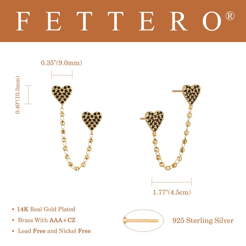 FETTERO Gold Chain Earrings for Women, 14K Gold Plated Hypoallergenic Earring for Multiple Piercing, Tassel Chain Black CZ Heart Pendant Double Piercing Stud Earrings | Charm Gold Earring for Women