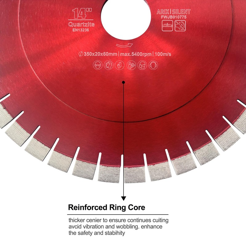 FEWELL 14inch Bridge Saw Blade for Cutting Quartz, 350mm Silent Core Diamond Blade with 20mm Arix Segment and 60mm Arbor with 50mm Ring