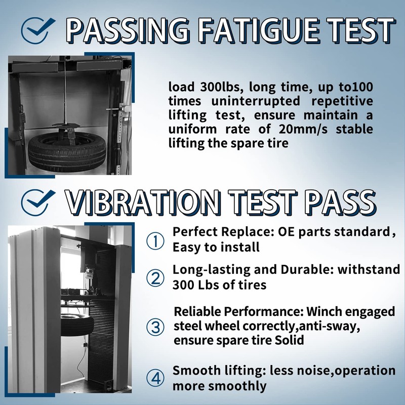 - 【Load Endurance Test】 Simulate The State After The Installation Of The Spare Tire, Suspension Corresponding To The Tire For Load Lifting Fatigue Test, Make Sure The Spare Tire Is Securely Locked. No More Miserable Experience After The Improved Design Of Removing Secondary Latch.
