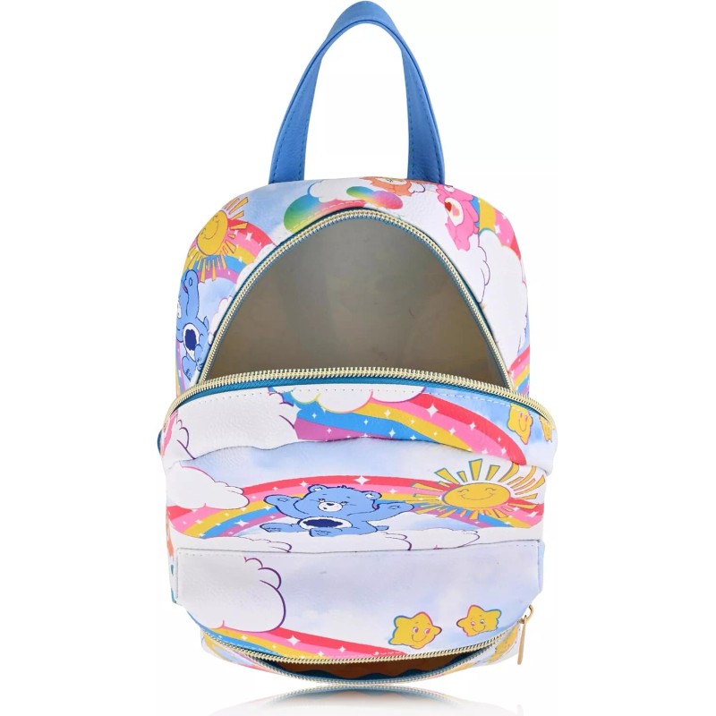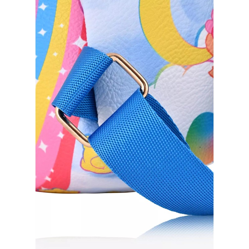 This adorable Care Bears shoulder purse is perfect for any fan of the lovable cartoon characters. Made from high-quality polyurethane, this mini backpack features a zip closure and an adjustable shoulder strap for a comfortable fit. The bag is designed with a solid multicolor pattern and features a bag charm accessory. The interior is lined with soft polyester material and has enough space for all your essentials. The handle and strap are made from the same material and are designed in white color with silver hardware. This Loungefly carebears product is a must-have for any collector or fan.