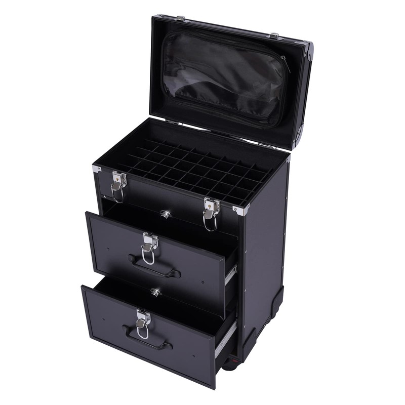 This rolling make-up case is suitable for professional make-up artists, hairdressers, nail technicians, and beauticians in beauty centers, salons, private homes, parties, and other occasions.