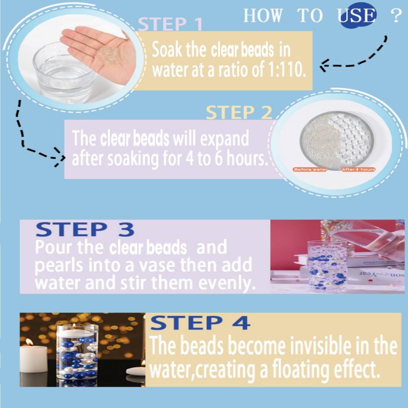 Value Pack: With 10,000 clear beads, 200 floating pearls, and 6 floating candles included, this set provides more than enough materials to bring your creative visions to life. Transform your decor with ease and the stunning results!
