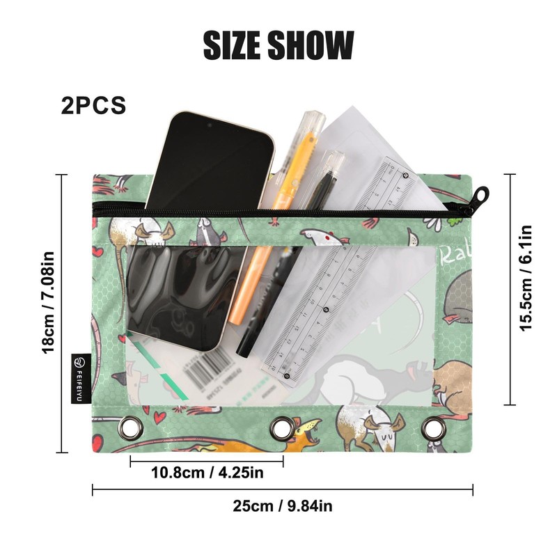 FFYHO Binder Pencil Pouch 2 Pack,Pattern with Fancy Rat Waterproof Pencil Pouches with Smooth Zipper, 3 Ring Clear Window Pencil Case Large Capacity for Teachers Clerk Doctors Nurses