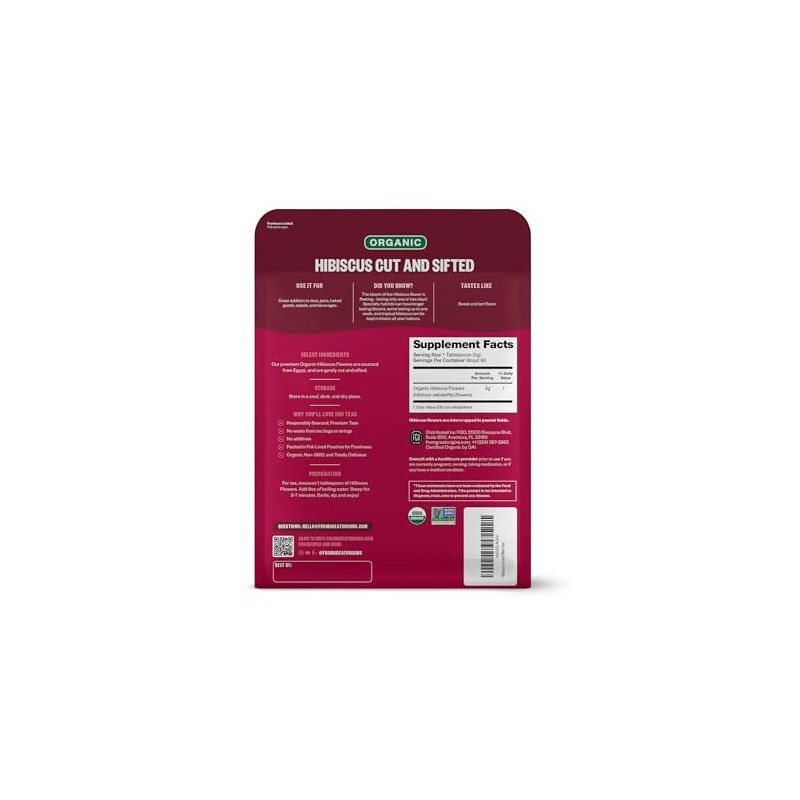- Flores orgánicas de hibisco (Hibiscus sabdariffa): bolsa de 16 oz que se puede volver a cerrar. Producto cortado y tamizado (1 lb).