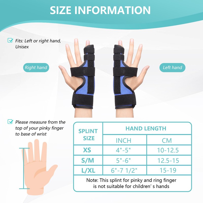 - SIZE GUIDE - Please measure the top of your ring finger to the base of your wrist before purchasing to choose the right size. S/M(Fits Most): Wrist to Fingertip --6inch, Max Wrist Circumference-- 10inch, Length of the Splint -- 8inch; L/XL(Larger Hands Only): Wrist to Fingertip -- 7inch, Length of the Splint -- 9inch, Max Wrist Circumference-- 10inch. Note: Fits most adult women and men; this brace for pinky and ring fingers is not suitable for children's hands.