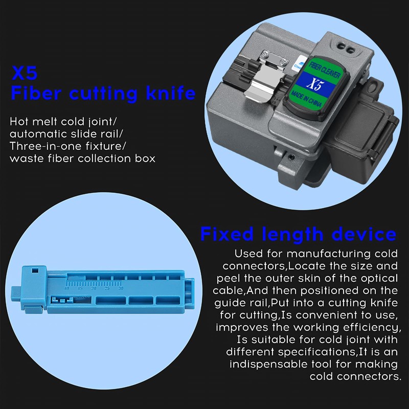 - X5 Fiber cleaver: Fiber Fixture is suitable for bare fiber, pigtail and leather cable. Applicable to single fiber 0.25/0.9/3.0mm fiber. With Fiber Scrap Collection box, this fiber cleaver is compact and light-weight , convenient to carry and use