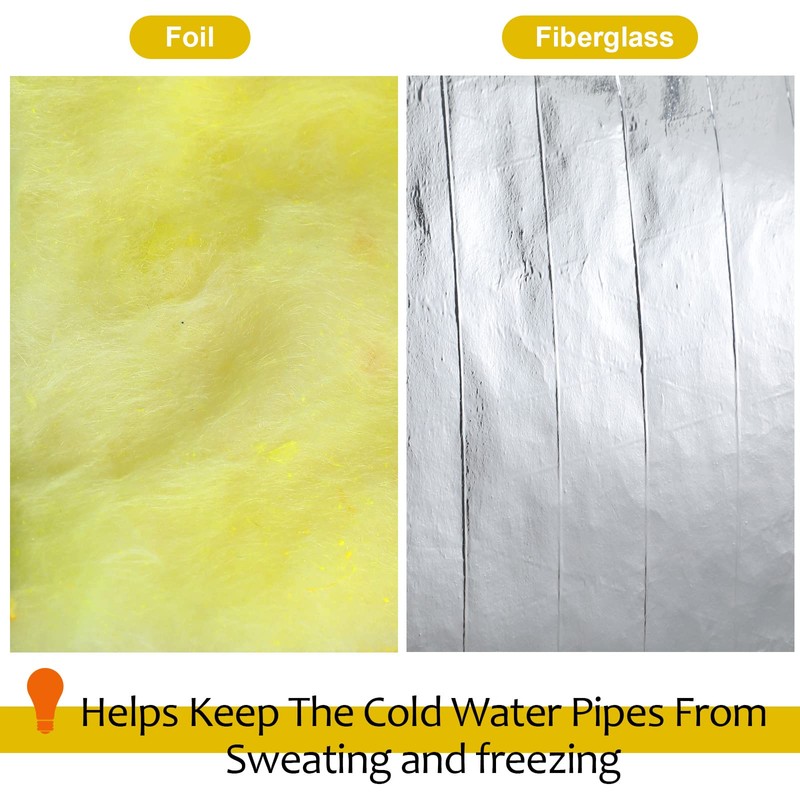 - Foil Backing: the insulation wrap is designed with foil backing, which can nicely lock in heat and reduce thermal radiation loss from hot water pipes, preventing the pipe from freezing in winter and sweating in summer