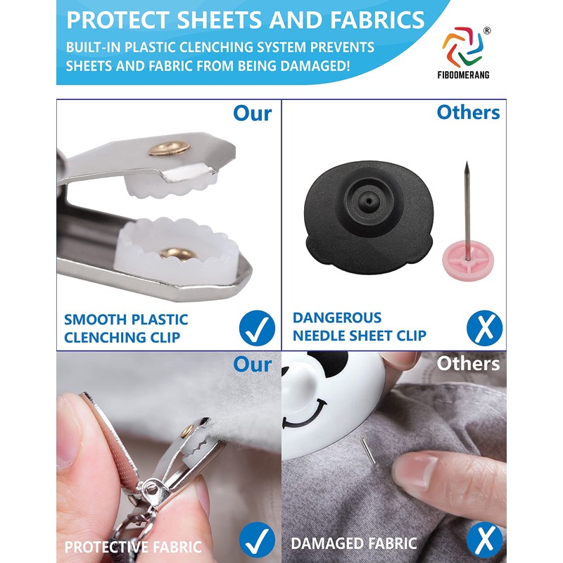 - 【PROTECT SHEETS AND FABRICS】 - Nickel-plated stainless steel clips, built-in plastic clenching system. The smooth high-quality plastic bite bites sheet tightly meanwhile protects bedsheets and fabric very well. Unlike other sheet clamps with needles, the fabric needs to be pierced to fix it, which can easily damage the sheet