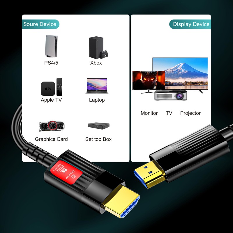 • 8K fibre optic HDMI cable: fibre optic HDMI cable built with gold-plated connectors, and top chips to ensure high-speed and flawless signal transmission, supports 8K @ 60Hz 4K @ 120Hz