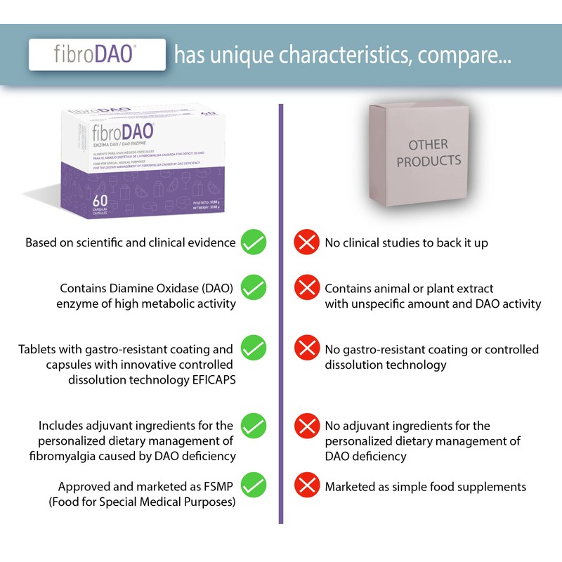 - ✔ Contains magnesium as an aid for the treatment of fibromyalgia, muscle pain and contracture, osteopathic pain and chronic fatigue due to DAO deficiency.