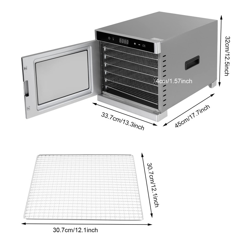 - 【6-Tray/8-Tray Capacity】The overall size of 13.3*17.7*12.5inch and 6 trays with a strong bearing capacity allow you to put in enough ingredients at once, avoiding frequent operations. And with a small size of 13.3*17.7*12.5 inches, stackable trays, and handles, our Food Dehydrator Machine is easy to store and move. The 1.57-inch tier spacing provides more space for thick foods