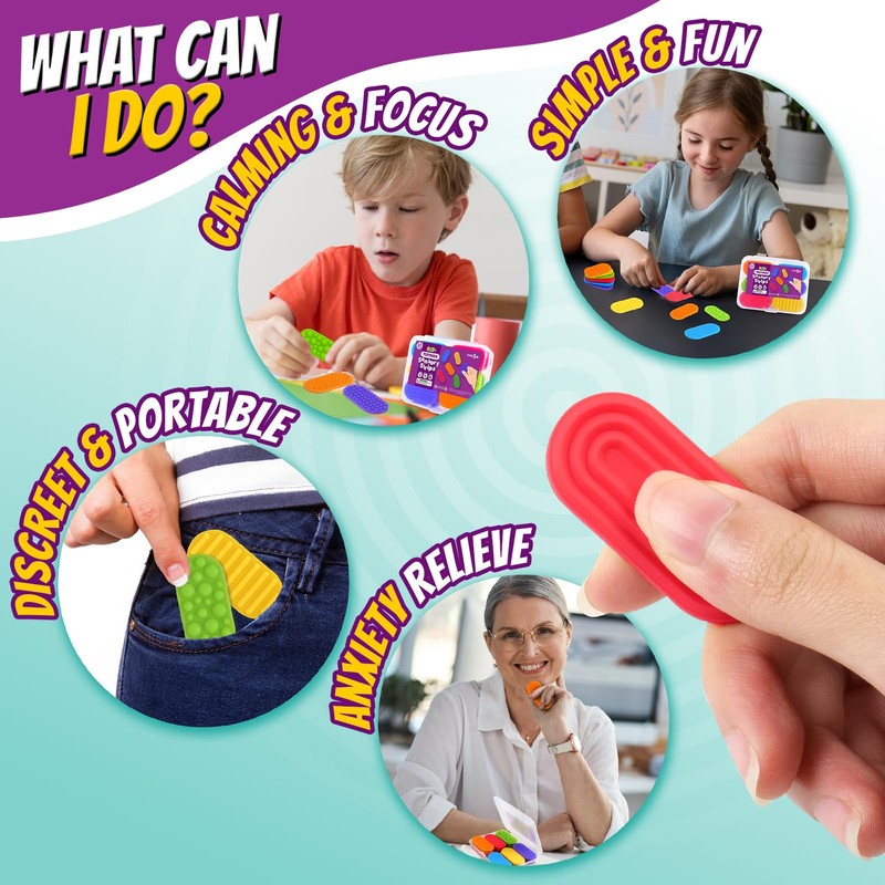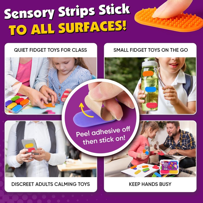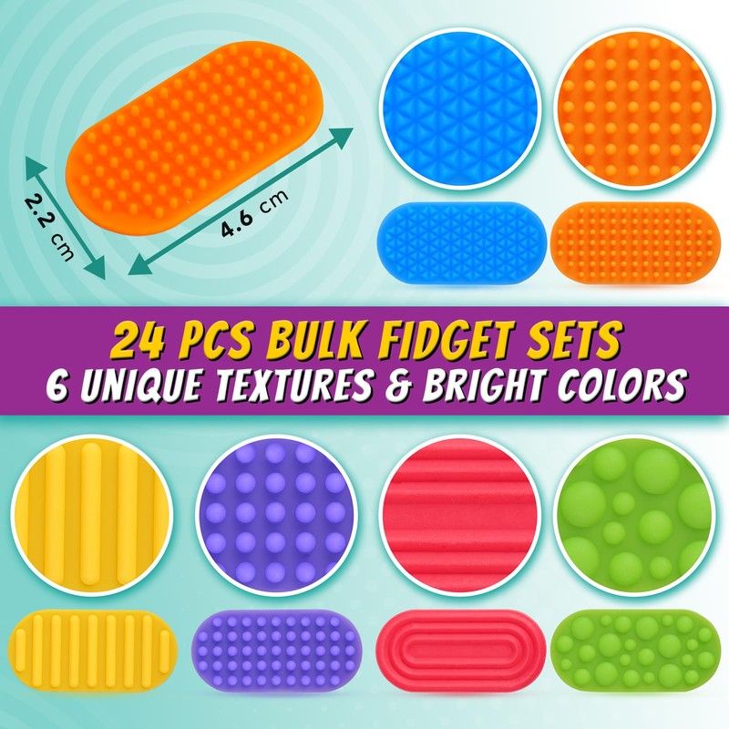 - Students School Focus Tool: School-age kids often find it hard to stay seated and concentrate. Our adhesive-backed texture fidgets are designed to solve this. 24 pack bulk fidgets popular among students and can stick to desks, attract kids' attention and encourage them to remain seated by providing a tactile experience that meet kids sensory needs by touching and gliding, replace picking fingers or biting nails