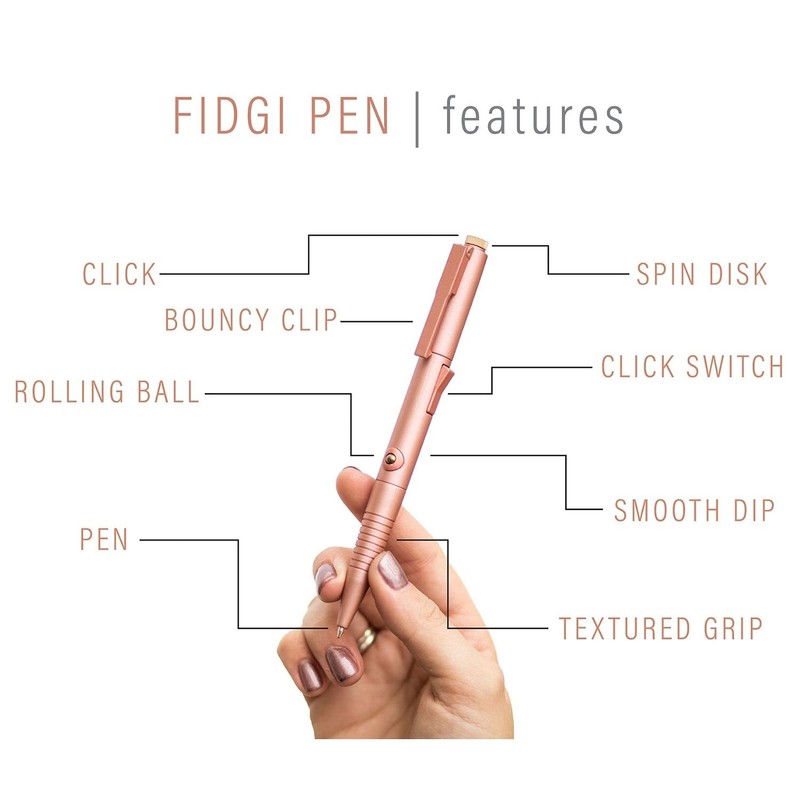 The original Fidgi Pen. A fidget toy cleverly disguised as a pen. Not only is it functional as a smooth writing instrument, it also uses universal ink cartridges so you can use it again and again! The Fidgi Pen was originally created to relieve the stress of work and school. Knowing how prevalent fidgeting was in the world, this product will benefit those who have ADD, ADHD and autism by helping them channel their fidgeting into a useful and discreet toy. Nervous? Stressed? Anxious? The original Fidgi Pen is made for YOU, too. It allows you to channel your focus and stay on task. It will relieve that stress from work and help you make it through class.The first pen of its kind with 7 different most popular ways to fidget: smooth dip, bouncy clip, textured grip, spin disk, click switch, rolling ball and pen click. It does all of this and remains slim, functional and unobtrusive.  Take the Fidgi Pen to school without your teachers getting mad about you playing with a toy. Take it to the office to entertain yourself during that boring conference call.Color coordinate in style! Fidgi Pen is available in six distinct colors: Stealth (black), Snow (White), Slate (gray), Navy (blue), Mint (green), and rose gold. Fidgi Pen can go wherever you need to go, do whatever you need to do, and fidget however you need to fidget.