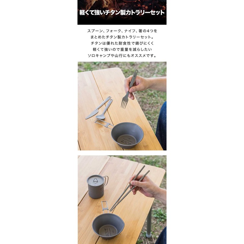 スプーン、フォーク、ナイフ、箸の4つをまとめたチタン製カトラリーセット。チタンは優れた耐食性で錆びにくく軽くて強いので重量を減らしたいソロキャンプや山行にもオススメです。