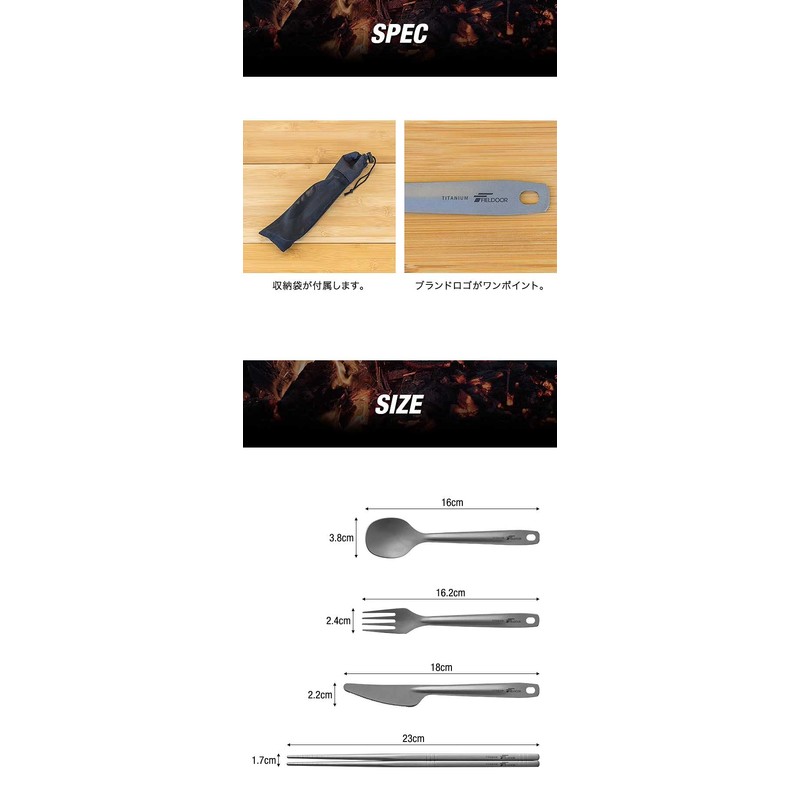 - ✅【軽くて強いチタン製カトラリーセット】 スプーン、フォーク、ナイフ、箸の4つをまとめたチタン製カトラリーセット。チタンは優れた耐食性で錆びにくく軽くて強いので重量を減らしたいソロキャンプや山行にもオススメです。