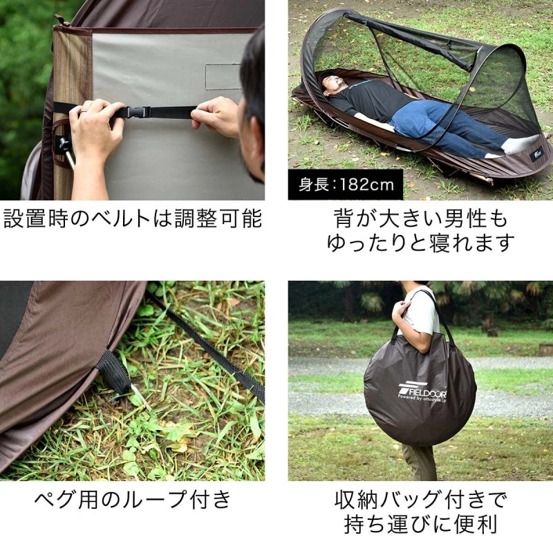 ? [Easy to set up just by opening it! ] A mesh tent that goes well with a cot! Easy to assemble just by opening! It is a pop-up mesh tent for one person. It can be used in a variety of ways, such as in a tent or sleeping in a car. Affinity with the cot is outstanding! ? [Can be attached to various cots! ] Just put it on the cot and put it on a rubber band, so you can easily install it on a variety of cots. It is a perfect item for camping that does not use an inner tent.