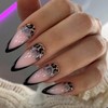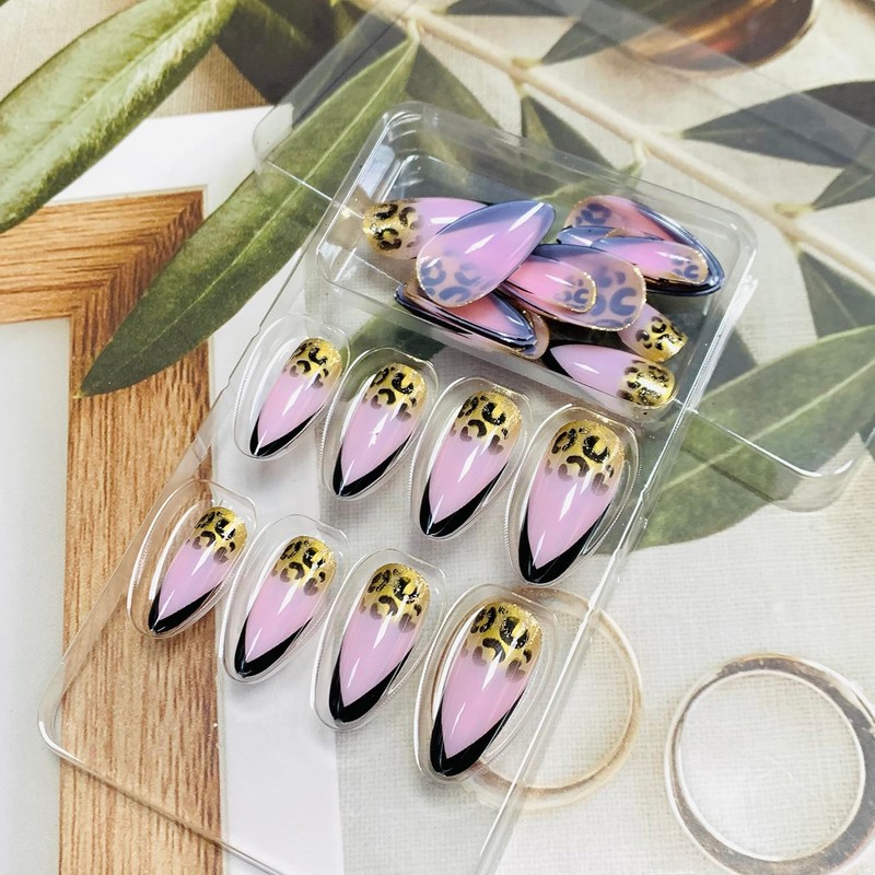 FIEONCIY Press on Nails Almond Shape-Glossy Full Cover Acrylic Black French False Nails with Leopard Designs Artificial Medium Almond Pointed Fake Nails Glue ons Nails Stick on Fingernails for Women