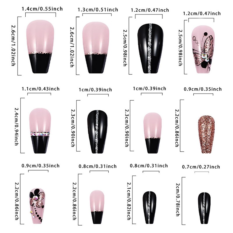 - False Nails Sets: You'll get 24 medium coffin false nails in 12 sizes. 1 mini nail file, 1 small wooden stick, 1 piece of press on nails adhesive sticky tabs