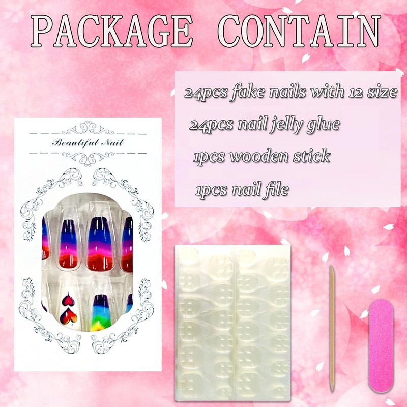 - False Nails Sets: You'll get 24 medium coffin false nails in 12 sizes. 1 mini nail file, 1 small wooden stick, 1 piece of press on nails adhesive sticky tabs
