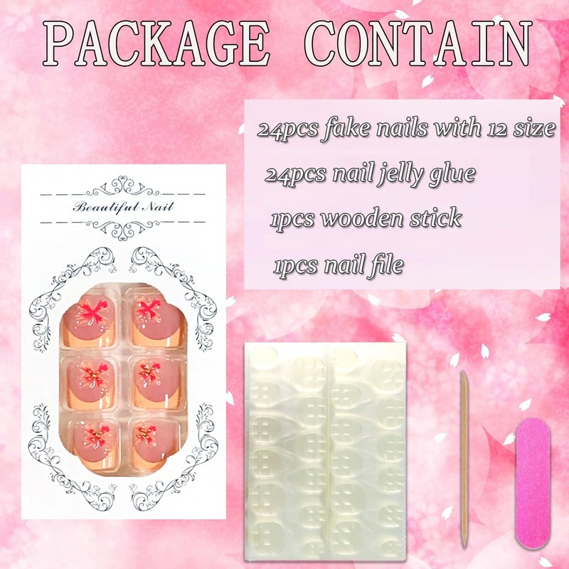 • False Nails Sets:You'll get 24 stick on nails in 12 sizes. 1 mini nail file, 1 small wooden stick, 1 piece of nail glue sticker. Glue on nails are perfect for most people's nails