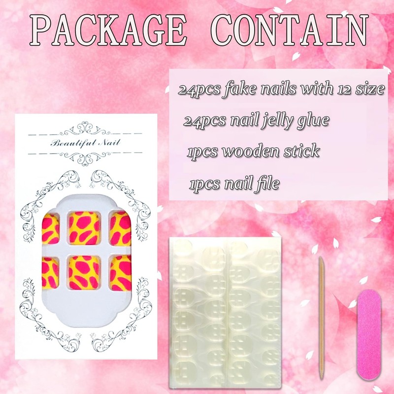 - False Nails Sets:You'll get 24 stick on nails in 12 sizes. 1 mini nail file, 1 small wooden stick, 1 piece of nail glue sticker. Glue on nails are perfect for most people's nails