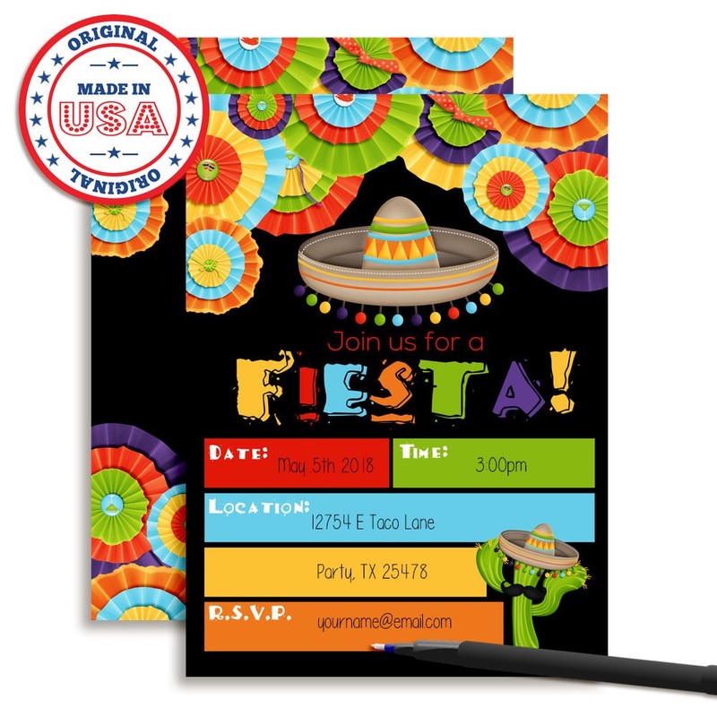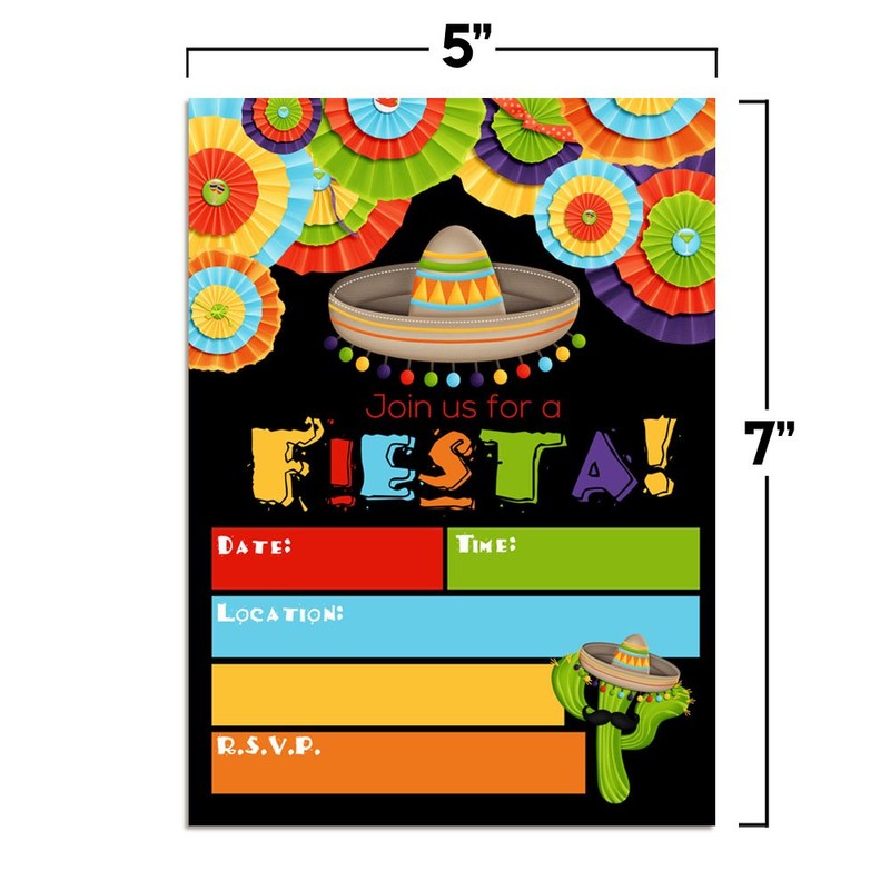 - Awesome Quality: Forget smaller, chintzier cards printed on flimsy paper. At 5"x7" your Fiesta Invites are bigger & sturdier than most. Plus, they're printed on 80# stock for ultra durability.