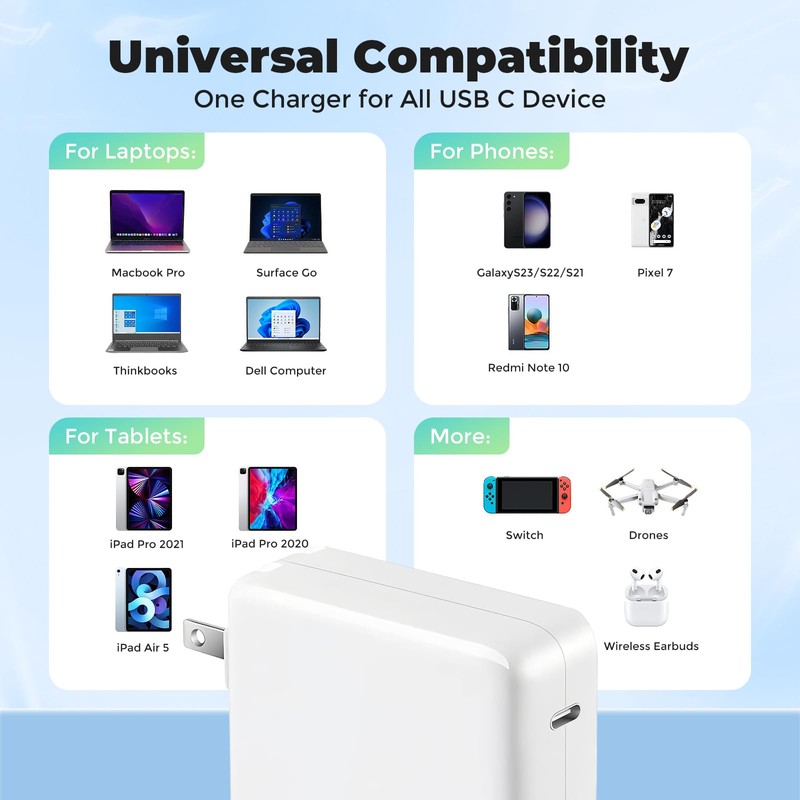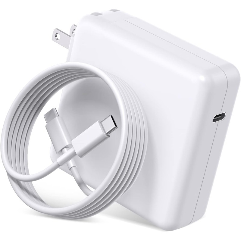 Compatible with Professional Charging PerformancePD 3.0 Technology: 96W max output | 100-240V global voltagePrecision Output: 20.5V/4.7A | 15V/3A | 12V/3A | 9V/3A | 5.2V/3ALab-Tested Results: MacBook Pro 16" 2025: 0-100% in 95 mins iPhone 15 Pro Max: 80% charge in 20 mins 11% more efficient than pro 87W charger One Charger for All Devices Mac: Pro 13"-16" (2016-2023)/Air M1-M4 Laptops: Dell XPS 13/HP Spectre x360 Phones: Galaxy S23/Google Pixel 8/Sony Xperia 1 V Enterprise-Level ProtectionDual Certification: CE/FCC + RoHS compliantSmart IC Chip Features: Real-time thermal monitoring (-20~60) Voltage fluctuation compensation (0.5V correction) 0.03s short-circuit response Premium EngineeringCable: 4-layer shielding + 5A tin-plated copper coreConnector: Zinc alloy with 10,000+ plug cyclesCompact Design: 3.352.561.26" (18% smaller than pro OEM) Package Contents96W GaN USB-C Charger 16.6ft Braided USB-C to C Cable 1