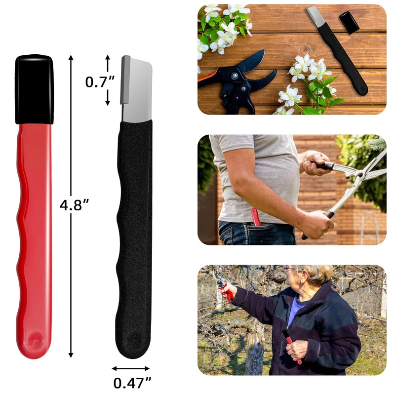 Package1 x Black Garden Tool Sharpener1 x Red Garden Tool SharpenerWide Sharpening ApplicationThe mini blade sharpener stone fit for pocket knives, pruners, hedge shears, axe, hatchets, machetes, various of garden tools,Also ideal for home cooks and cooking enthusiasts and other small tools. Enhancing sharpening efficiency.Compact and PortableThis garden tool blade sharpener is pocket size, easy to carry, small and lightweight, suitable for carrying in pocket.Quickly to sharpening your tools when camping or outdoors.Ergonomic DesignThe handle non-slip and wear-resistant, comfy to grip, helps to rub the knife smoothly and safely.This garden knife sharpener with a plastic cover for the carbide tip, keeping you safe while taking it and prevent unnecessary wear of the sharpenerEasy to UseThe knife sharpener is made of tough tungsten steel, sharpen the knife finely and quickly, feature a carbide blade ensure durability and performance.Sharpening the two sides of the knife with this garden tool sharpener.