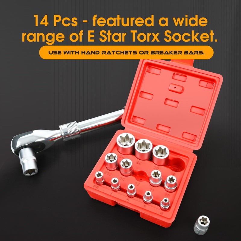 • Versatile use: 1/4 inch drive - E4, E5, E6, E7, E8, 3/8 inch drive - E10, E11, E12, E14, E16, 1/2 inch drive: E18, E20, E22, E24.