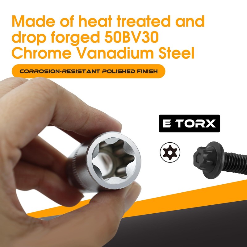 • Versatile uses: The E-torx socket spanner set can meet your work needs. It is an essential tool for your car, motorcycle, bicycle, lawnmower, electrical appliances, machinery, etc.