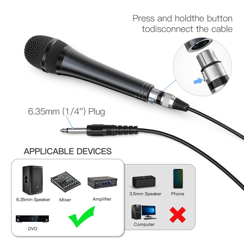 • 🎤A XLR TO 1/4” CABLE INCLUDED-Allowing the wired microphone for karaoke to be directly plug in amplifier speaker or karaoke machine that has 1/4inch (6.35mm) mic in jack. The dynamic vocal microphone protected by two-tire PVC, and it’s thick enough for brilliant, transparent sound transmission with no loss. The corded microphone with 14.8ft-long enough cable can be moved unimpeded so you can concentrate on nothing but the performance.