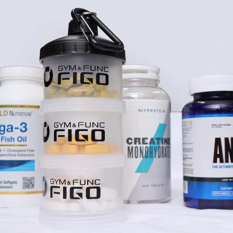 - GYM&FUNC FIGO brand protein supplement case. Combines 3 individual containers of a funnel with caps