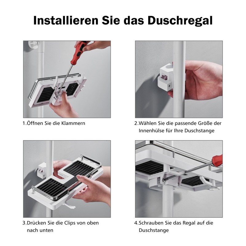 - Adjustable height: shower organiser can move to any height you want. The shower basket fits 1 pair buckles for 21mm - 25mm shower rod (Note: 1. Not suitable for square bars. 2. Please measure the diameter of your shower rod whether it is suitable).