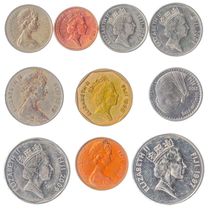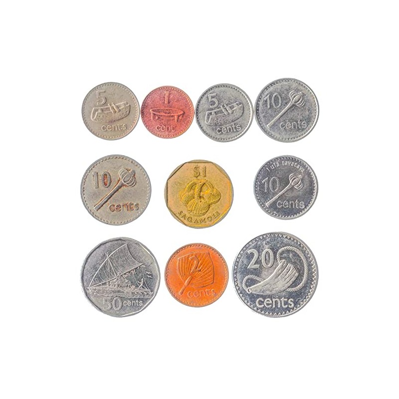 - 10 MIXED COINS FROM FIJI. Old - circulated coins were picked from the numismatic period: Dollar since 1969. Each bag may have different combinations of coins, mixed dates. Fijian coins from 1 cent to 1$. Please note, coins may look the same but they have small differences.