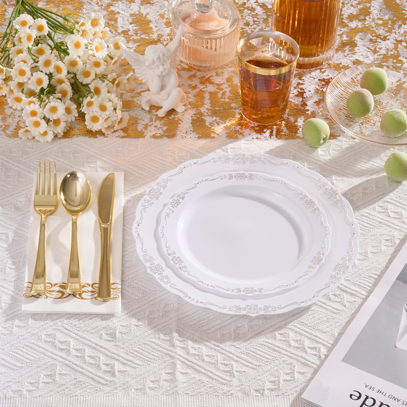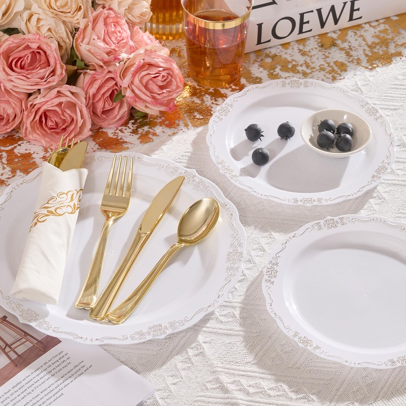 - ELEGANT DESIGN: Elevate any events with our gold plastic plates. They have an exquisite gold - rimmed, ornate-style design, adding elegance to your table. Great for party planners wanting a romantic and charming vibe, combining function and style for memorable gatherings.