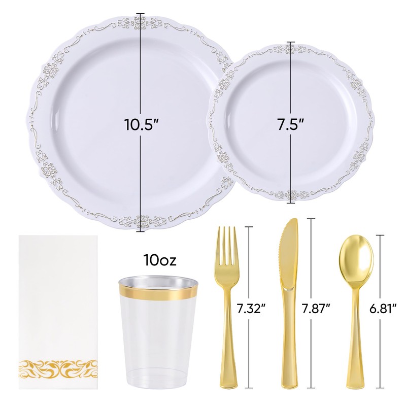 - YOU WILL GET: The boho gold plates set includes 50 10.25-inch plates, 50 7.5-inch dessert plates, 50 knives, 50 forks, 50 spoons, and 50 cups, as well as 50 Napkins. Packed with a box and film, items stay damage - free in transit.