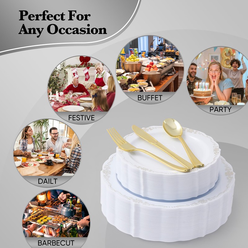 - PERFECT FOR ALL OCCASIONS: Versatile and stylish, our white and gold party plates suit any event. From weddings and Christmas parties to home dinners, birthdays, anniversaries, showers, catering, and corporate gatherings. The set fits various themes, making your table flawless, be it formal or casual.