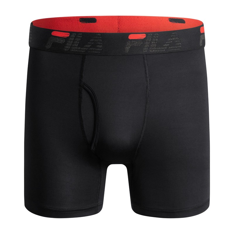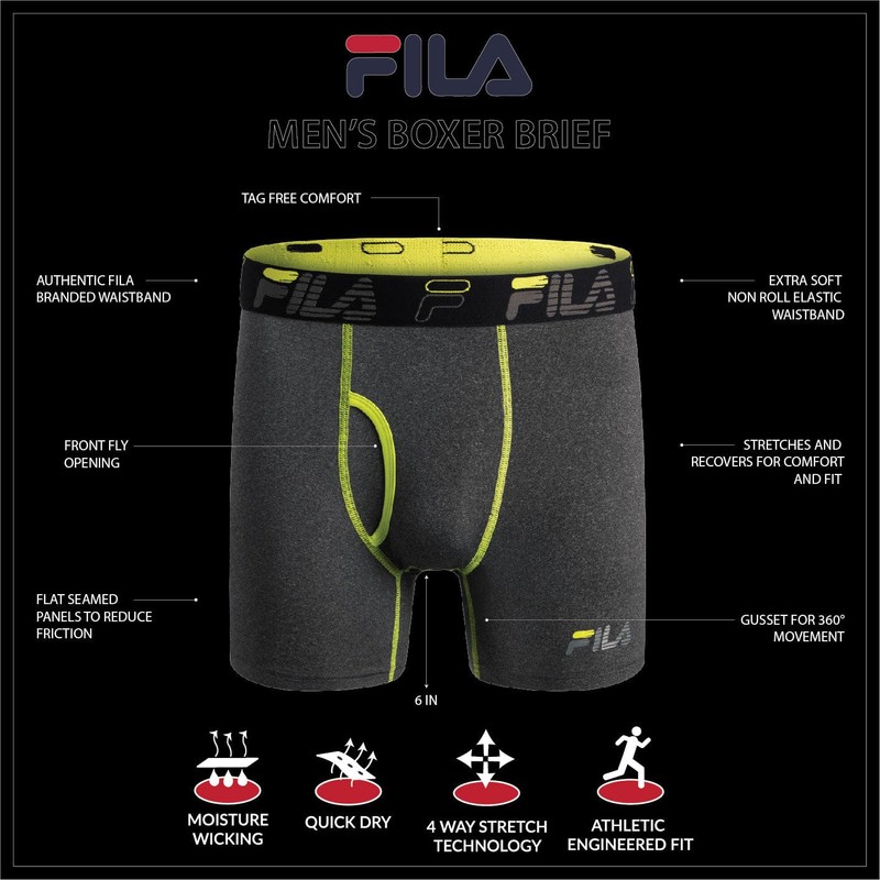 - What's Included: Fila Men's 6" Boxer Briefs Fly Front 4-Pack. The sizes are available in sizes Small, Medium, Large, X-Large, XX-Large, XX-Large, 3X-Large and 4X-Large. View size chart for a more accurate fit. You will never want to take these Fila Men's 4-pack Boxer Briefs off! They are built for comfort and ease of loungewear for men.