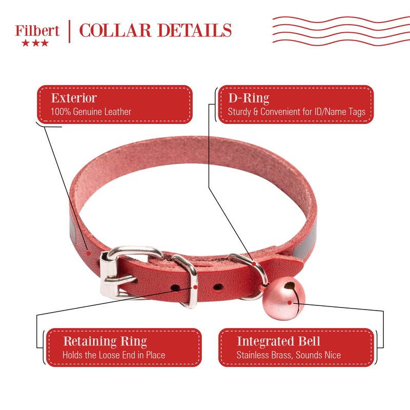 - PROTECTIVE AND DURABLE💪: We know what you are looking for. A meowtastic genuine leather cat collar, honest-to-goodness gorgeous yet sturdy, and will hold up for years; handmade with passion and attention to detail, will make it easy to spot your Furball Overlord😾 during nighttime adventures and add an extra layer of security, and will help you keep track of your mischievous Master of Chaos 🙀. So, we are thrilled to introduce Filbert's reflective cat collar with bell