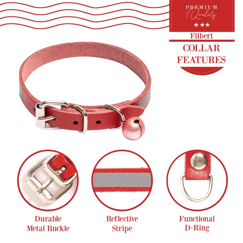 Filbert Leather Cat Collar, Reflective Cat Collar, Leather Accessories with Bell, Bird Warning, Suitable for Indoor and Outdoor, Non Breakaway, Durable, Stylish Design, Red