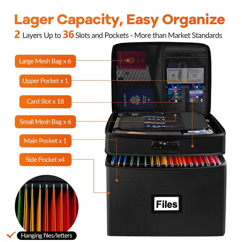 - [Upgraded 36 Pockets and Slots for Storage Filing Cabinet Box] - Our fireproof document organizer storage with 36 pockets can store various items, such as hanging letters, legal-sized folders, books, diaries, laptops, passports, cash, and more. This fire resistant document holder is a versatile filing box that can be used in homes, offices, banks, hotels, or malls, providing a daily protection for your goods. The fireproof box size is 15.57 IN(Length) X 13.78IN(Width) X 12.6 IN(Height).