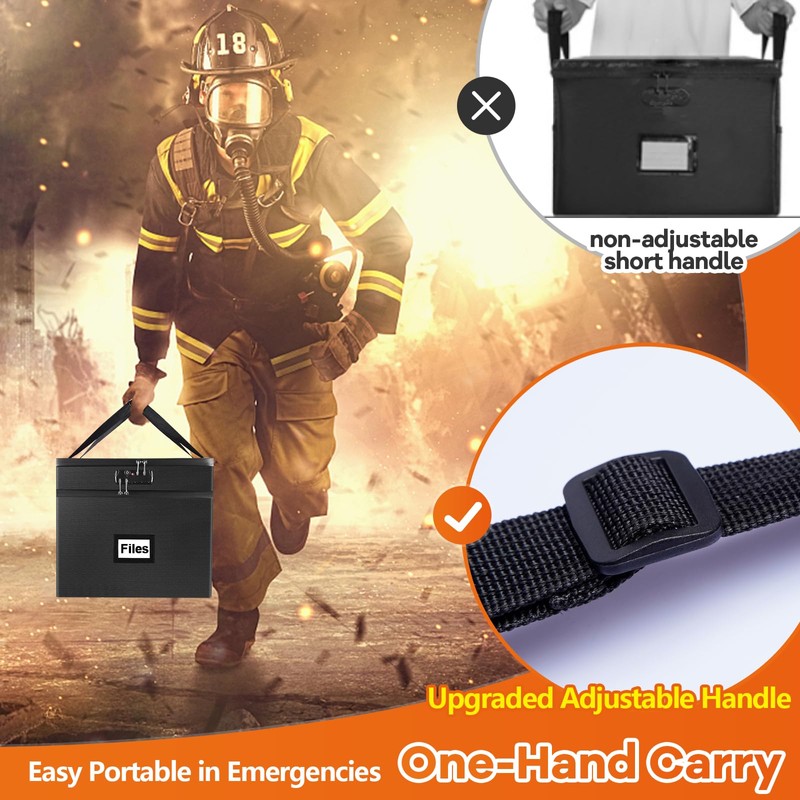 - [Adjustable Handle for ONE-HAND-CARRY] - The portable fireproof document organizer storage comes with a lightweight and durable design, the convenient handle can be adjusted to one-hand-carry which makes it easy to carry and move in emergencies. Whether you're traveling, moving to a new house, or just need to protect your items on the go.