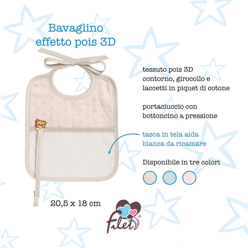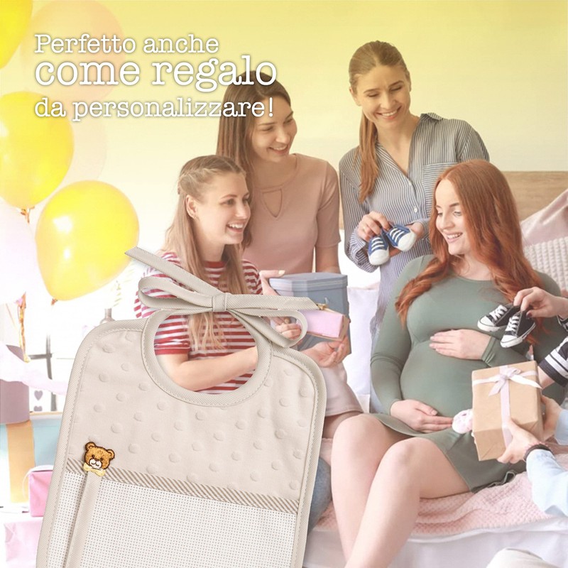 - Box contents: at home you will receive a bib in beige and white. It is made of soft cotton with 3D effect, double with a white flannel layer for better absorbency, with bear shaped dummy holder and bag made of Aida fabric for embroidery, closure with ribbon to tie and remove the neck. Made and packaged in Italy.
